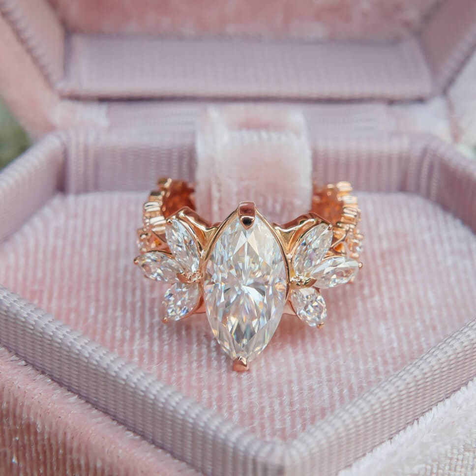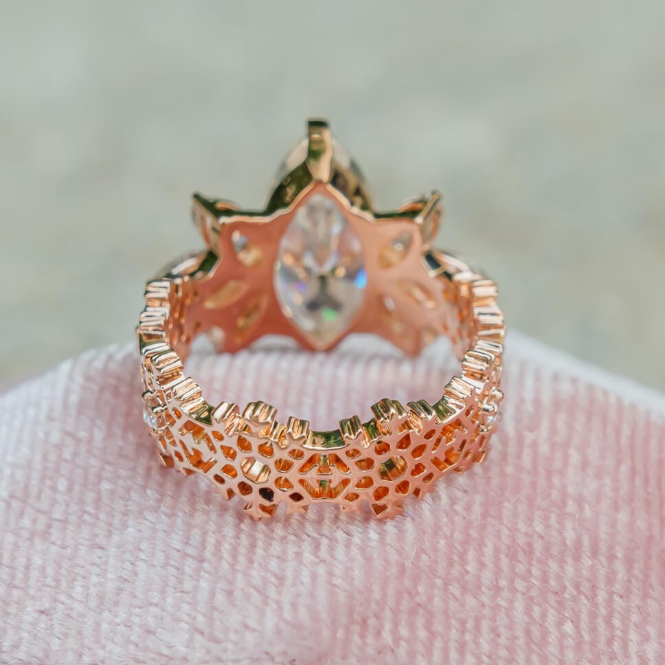 The journey of crafting the Custom 3ct Moissanite Snowflake Engagement Ring began with a simple, yet deeply romantic story shared by a customer with no specific design in mind but a heart full of love. Inspired by the narrative of their unique meeting and the special bond they share, we embarked on a creative endeavor to encapsulate those precious moments. This ring's design, from its snowflake-inspired shank to the bespoke placement of the marquise stones and the intimate engraving of geographical coordinates, serves as a testament to their love story. It's a celebration of their journey, transformed into a timeless piece of jewelry, meticulously tailored to embody the essence of their connection and the beauty of their tale.