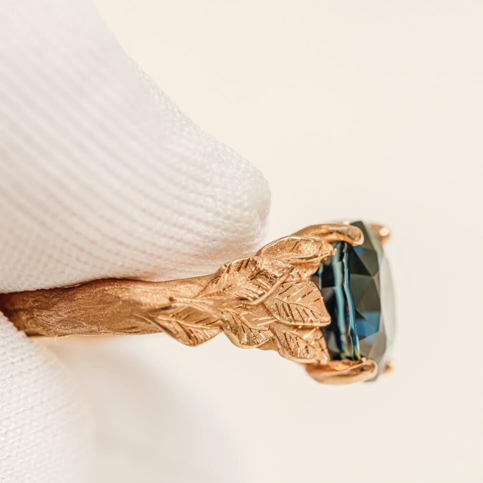 This custom-made ring showcases a mesmerizing blue-green sapphire, reflecting the ocean and forest's hues. Set in a detailed yellow gold branch design, it's a unique symbol of love and nature's beauty.