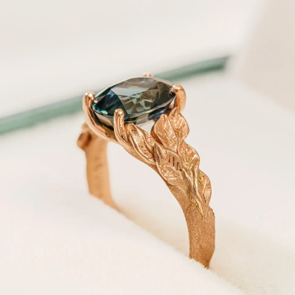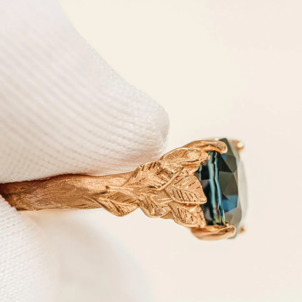 This custom-made ring showcases a mesmerizing blue-green sapphire, reflecting the ocean and forest's hues. Set in a detailed yellow gold branch design, it's a unique symbol of love and nature's beauty.