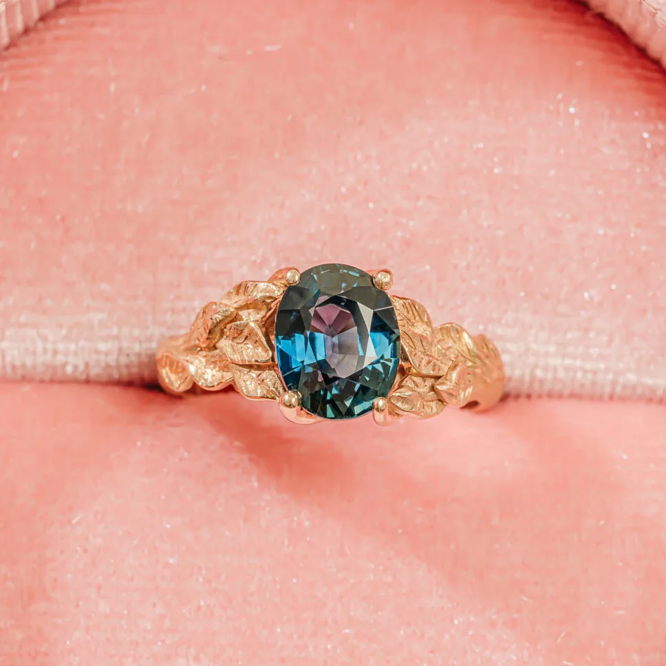 A rare blue-green sapphire, hand-set in matte yellow gold, with a sculpted branch-like band that echoes the calm, grounded beauty of the woods they love.