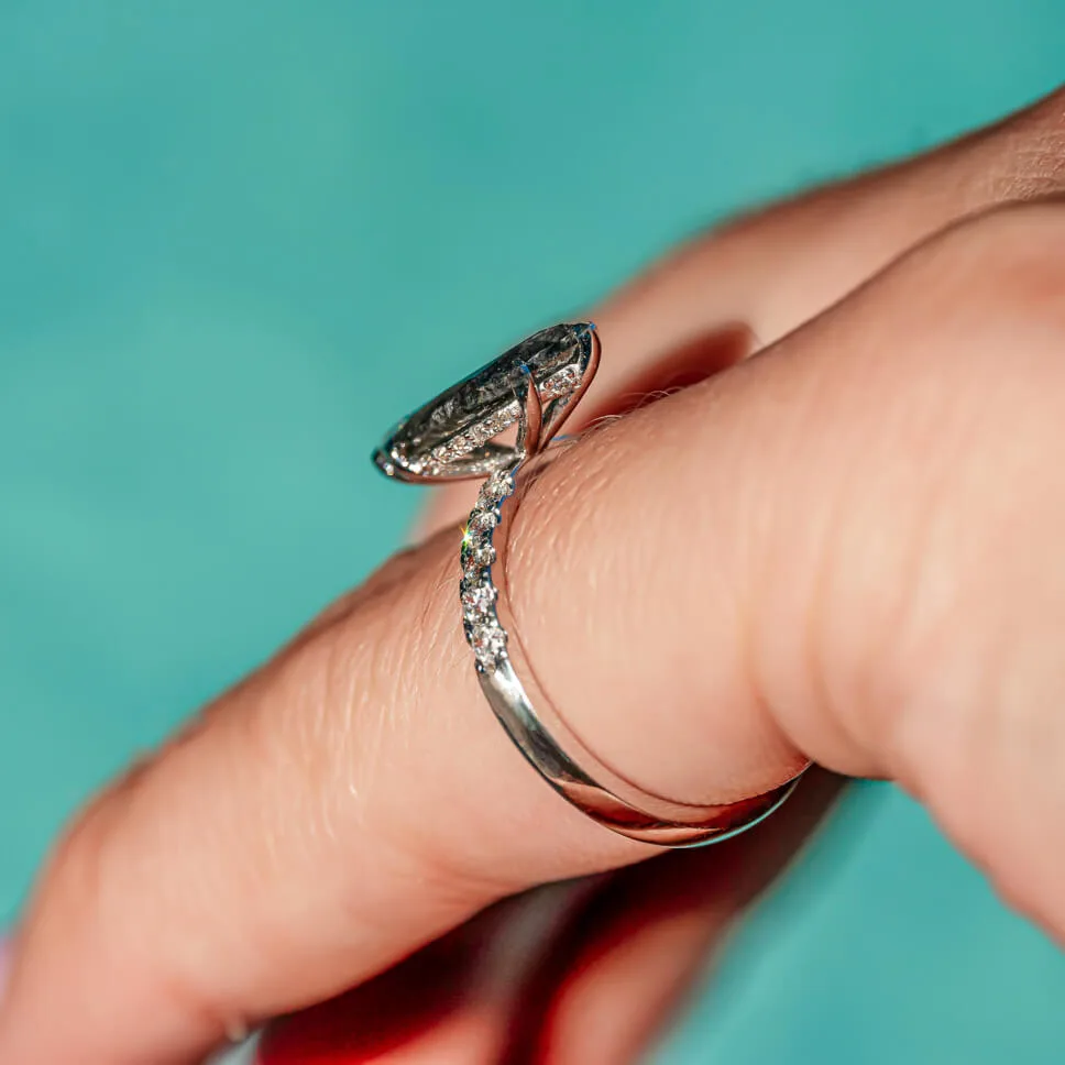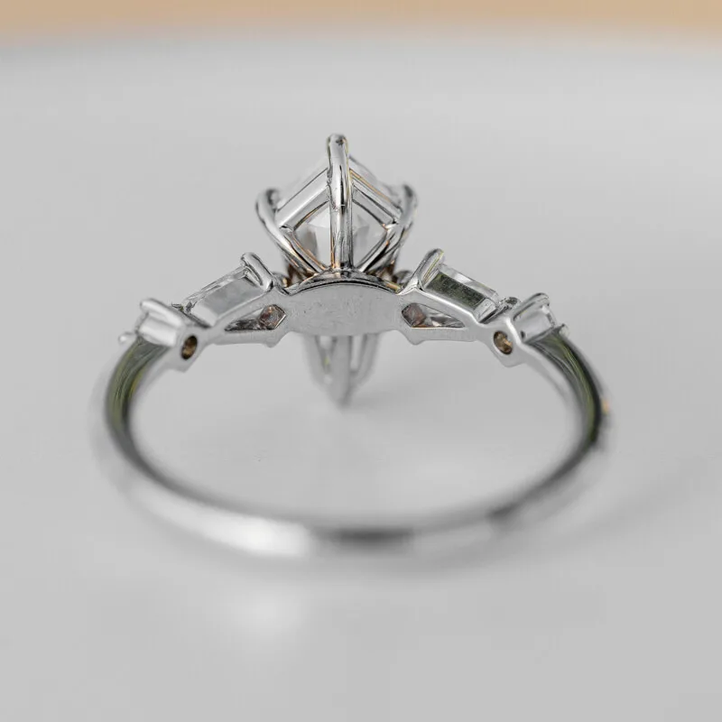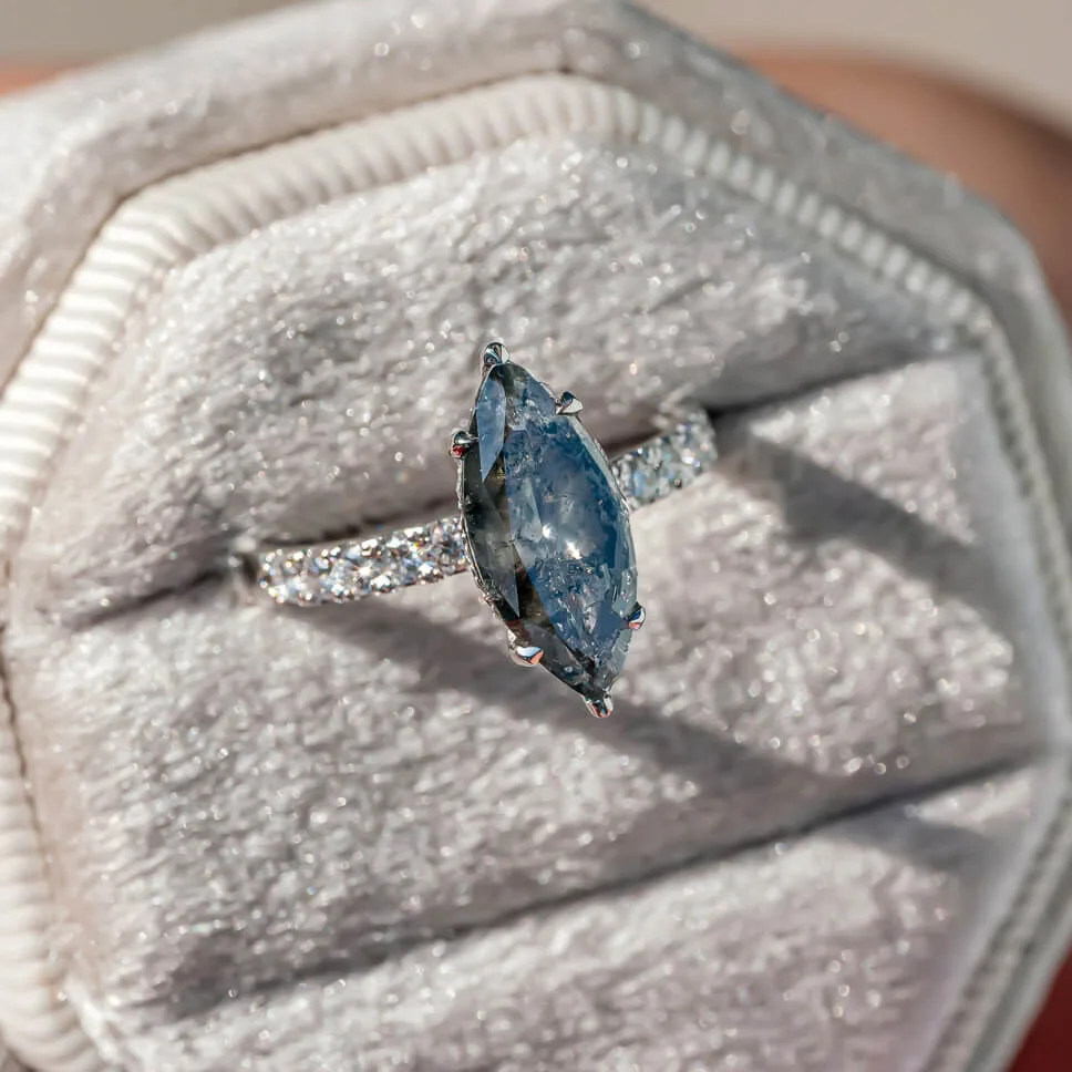 We started with the marquise silhouette for elegance. Then softened the edges with side stones. The result? A ring that still reads “engagement,” but carries her energy.