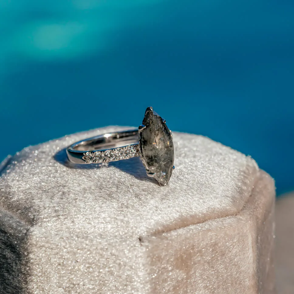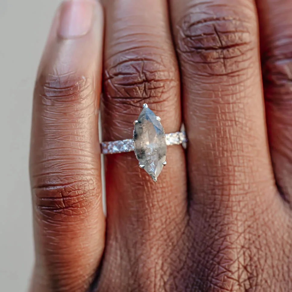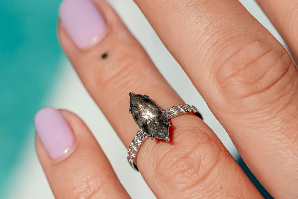 What we ended up creating was a piece that walked the line between classic and dramatic — a 1.6ct salt and pepper diamond in a marquise cut, surrounded by delicate side stones and set with precision.
